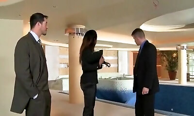 Teen gorgeous black-haired babe fucks with three brutal guys