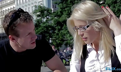 Towheaded bombshell Kay Lovely leaves her glasses on while having sex